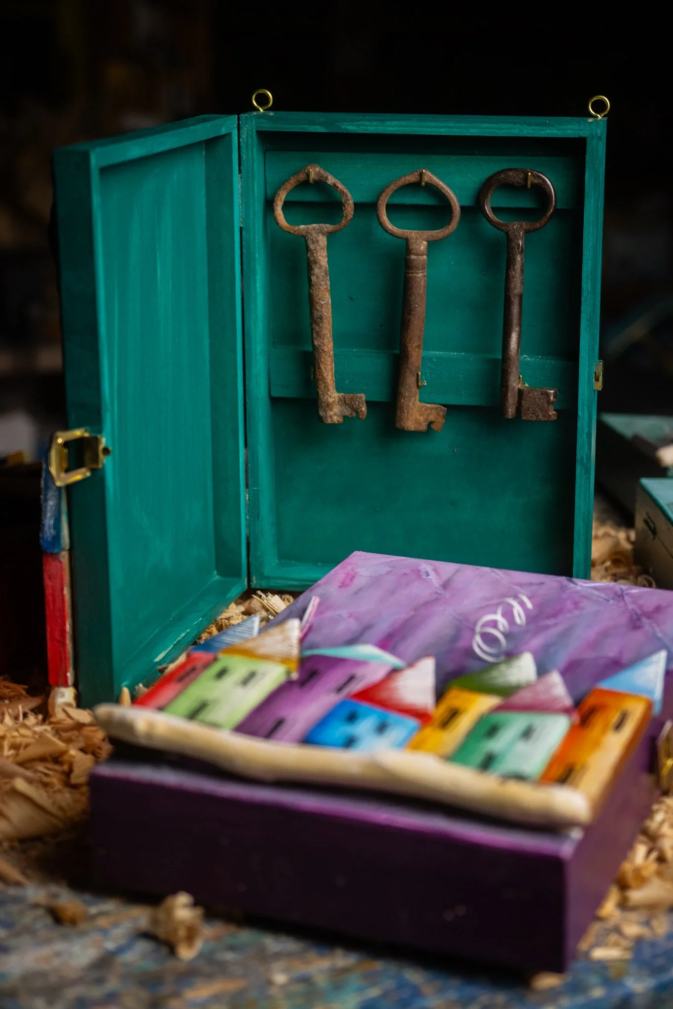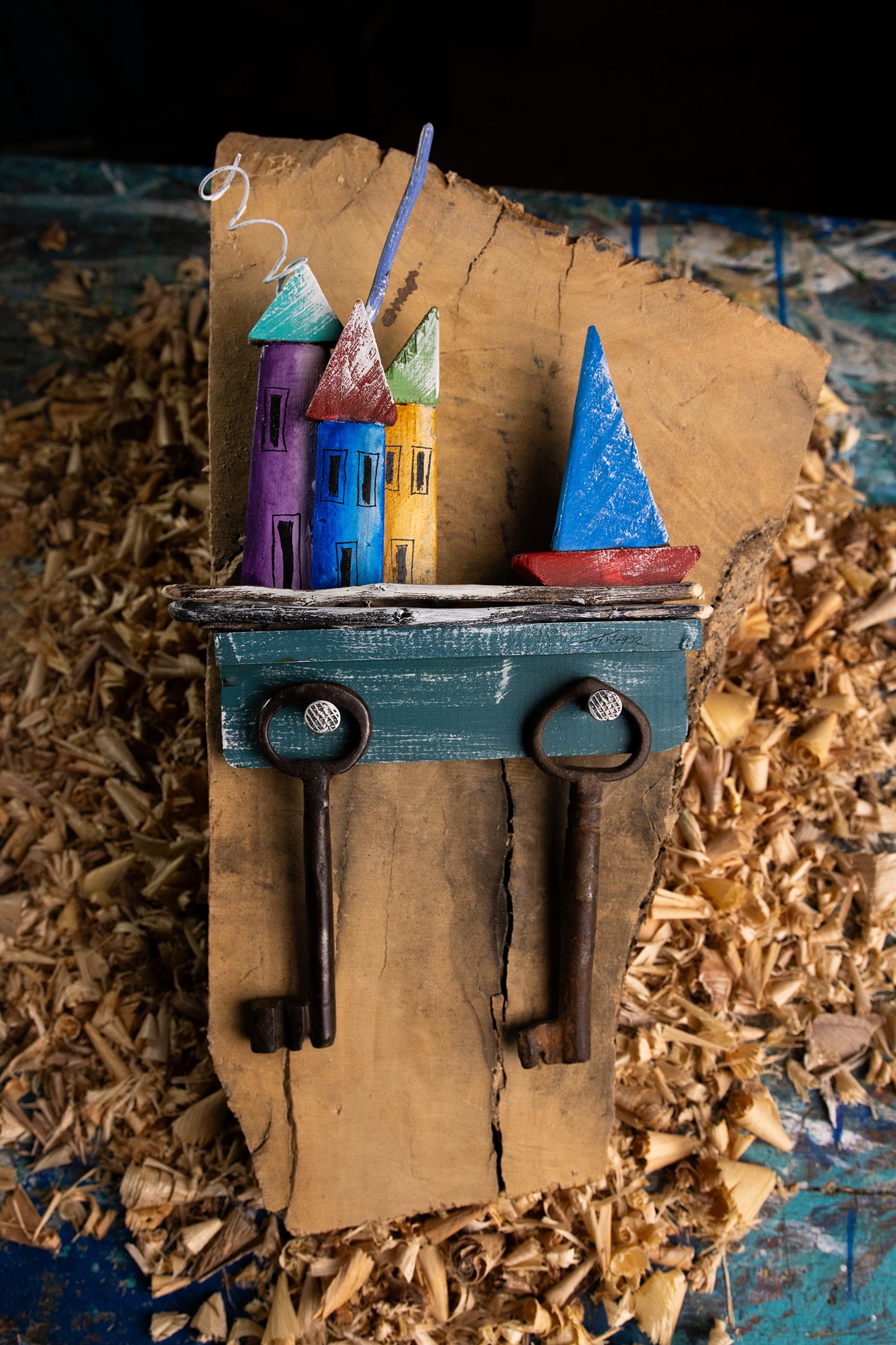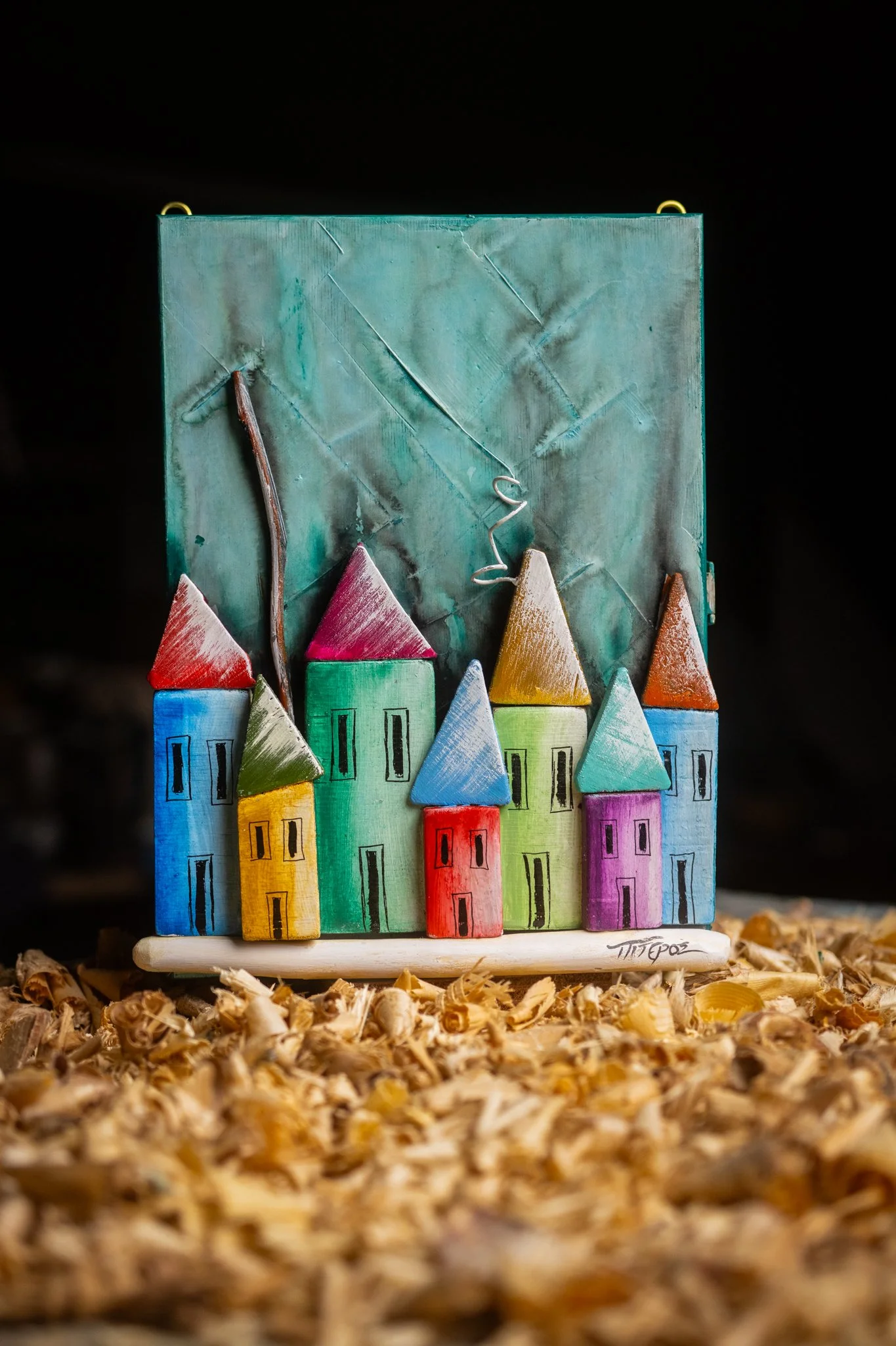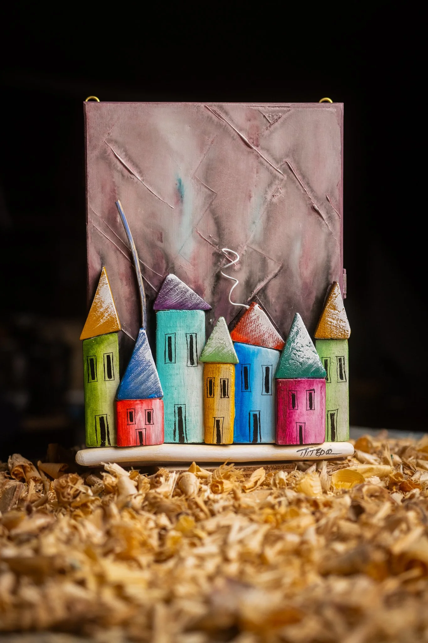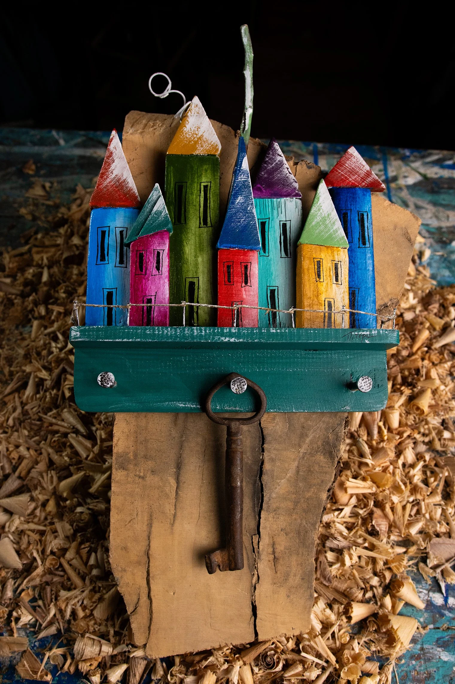 Wooden Key Case with Colourful Houses. Dimensions 29x21x7cm / 300gr