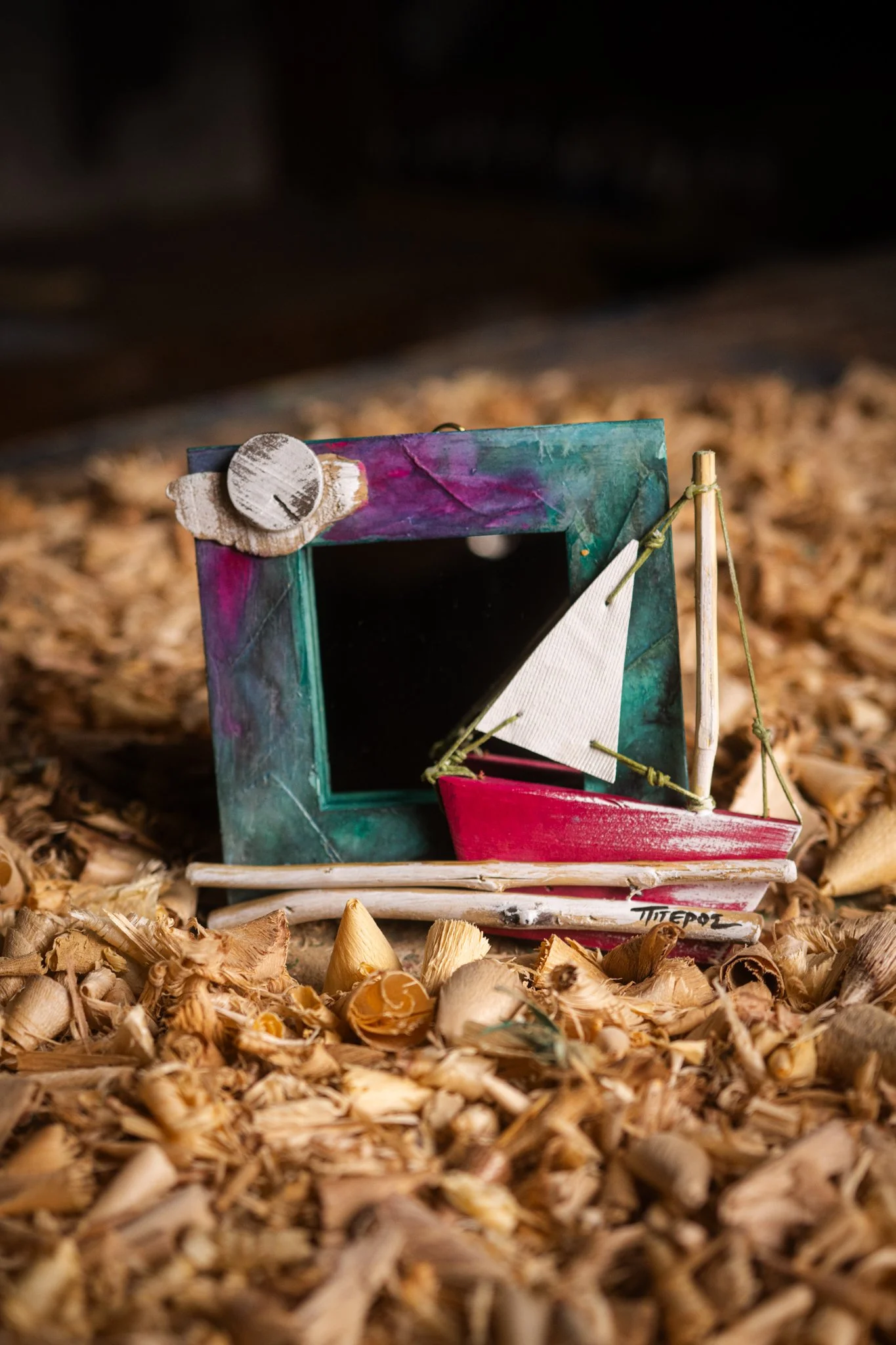 Colored Vertical Wooden Mirror with Houses or Boat. Dimensions 37x17x3,5cm / 230 gr