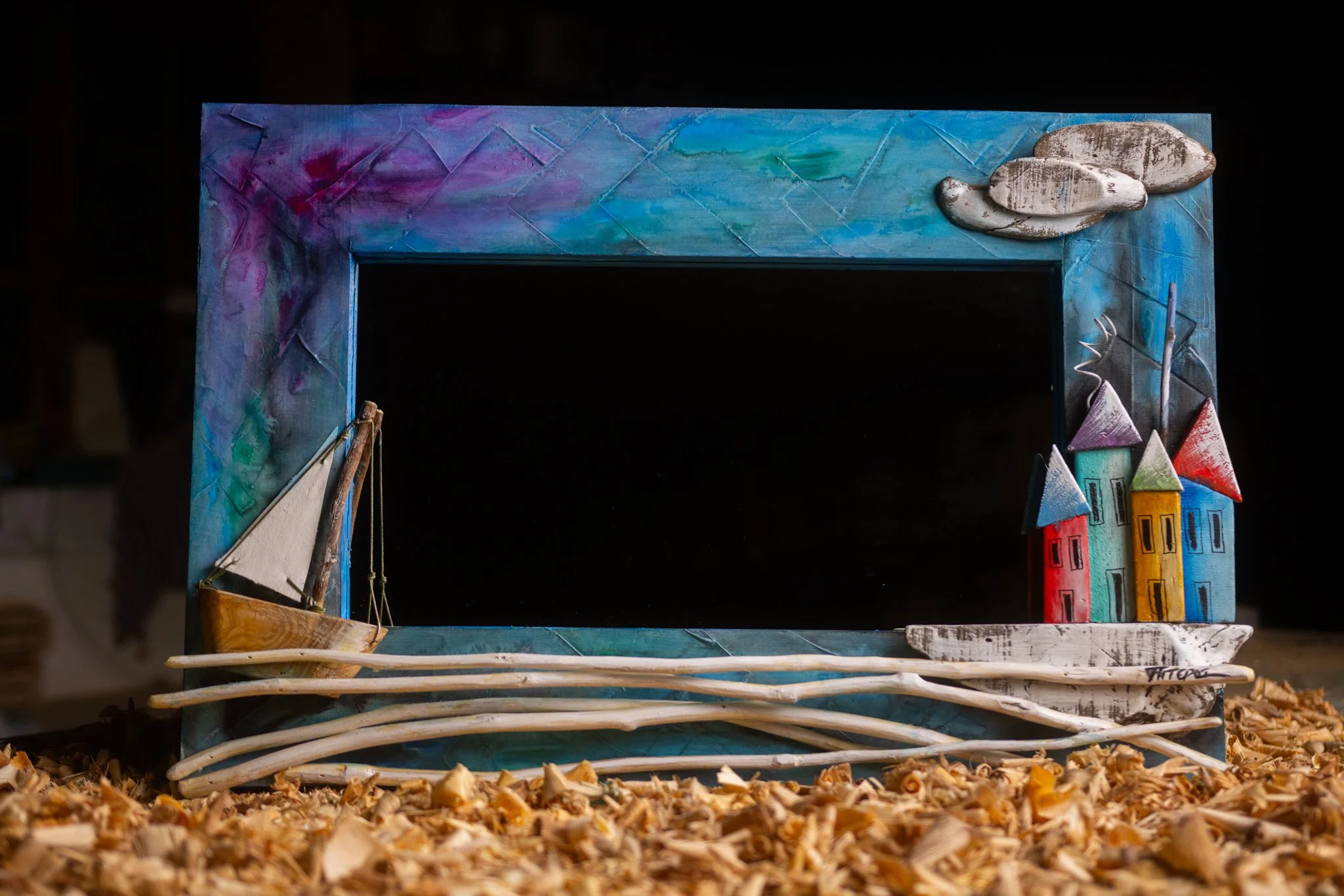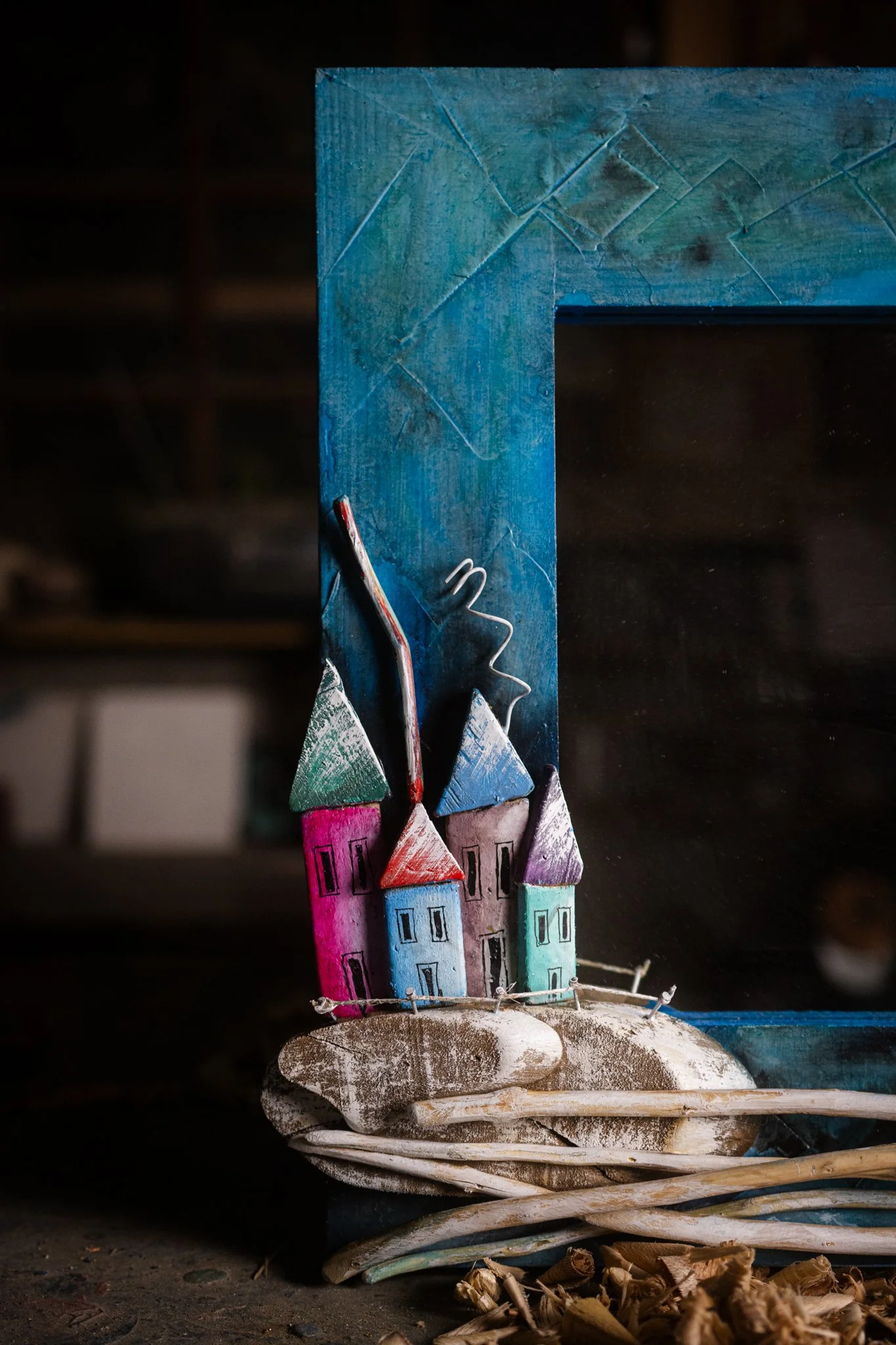 Colored Vertical Wooden Mirror with Houses or Boat. Dimensions 60x40x4,5cm / 1100 gr